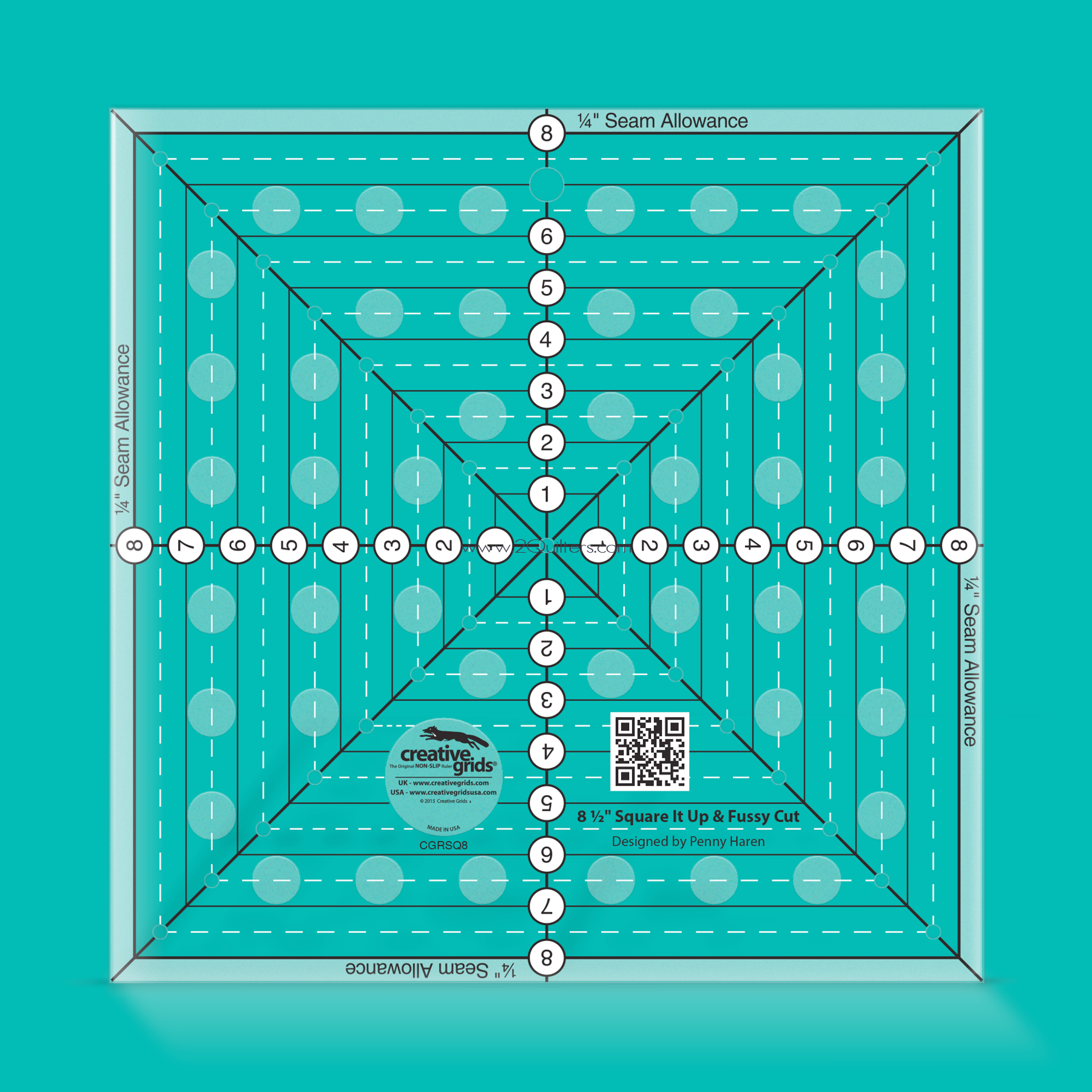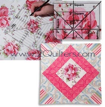 Use the horizontal, vertical, and diagonal markings to square up any block up to a 8-1/2 inch square. Use these lines to center and trim embroidery designs, applique blocks, and even fussy cut T-Shirts for T-Shirt quilts. (Fussy cutting is choosing a specific design in the fabric to showcase in your project.)